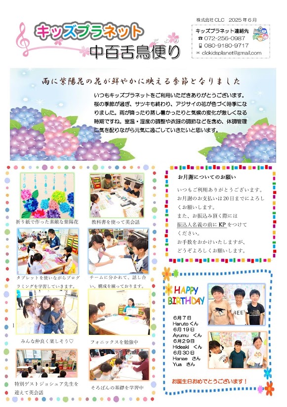 中百舌鳥校 6月号 お便り